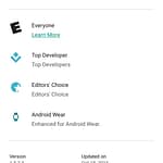 Todo esto funciona perfectamente bien y puede ser considerado como un pequeño filtro visual que nos ayudará a saber, si una aplicación Android es compatible o no con nuestro SmartWatch. Lastimosamente esta característica (el pequeño icono con forma de reloj) no llega a aparecer en la versión web de Google Play Store de un ordenador de escritorio ni tampoco, en la versión «web móvil» de cualquier dispositivo.