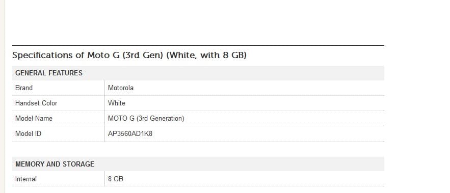 A continuación te compartiremos la imagen que se llegó a capturar desde la tienda, en donde claramente se puede observar que este nuevo modelo «Moto G» está plenamente identificado como una «tercera generación»; además de ello, en diferentes partes de la captura se logra ver que el terminal, estaría disponible únicamente en color blanco y con un espacio de almacenamiento interno de 8 GB. A pesar de ser la única información que se ha logrado ver en las capturas de pantalla, un aspecto completamente extraño es el que ha sido analizado por expertos y desde donde, prácticamente se estarían mencionando las especificaciones con las que vendría este nuevo teléfono móvil Android.